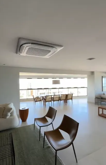 Cassete 4 vias de 36.000 a 48.000 BTU. Embutido no forro, distribui ar em 4 direções sem ocupar parede. Custo total: R$ 10.000 a R$ 20.000.